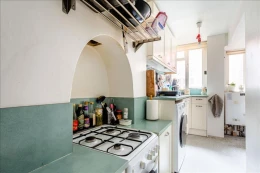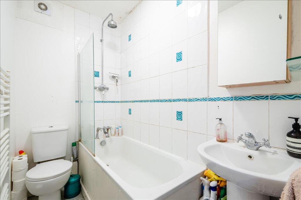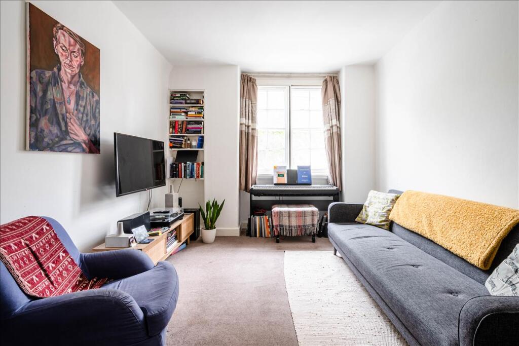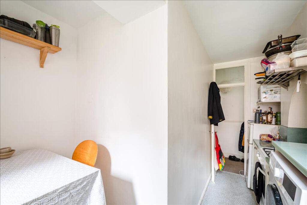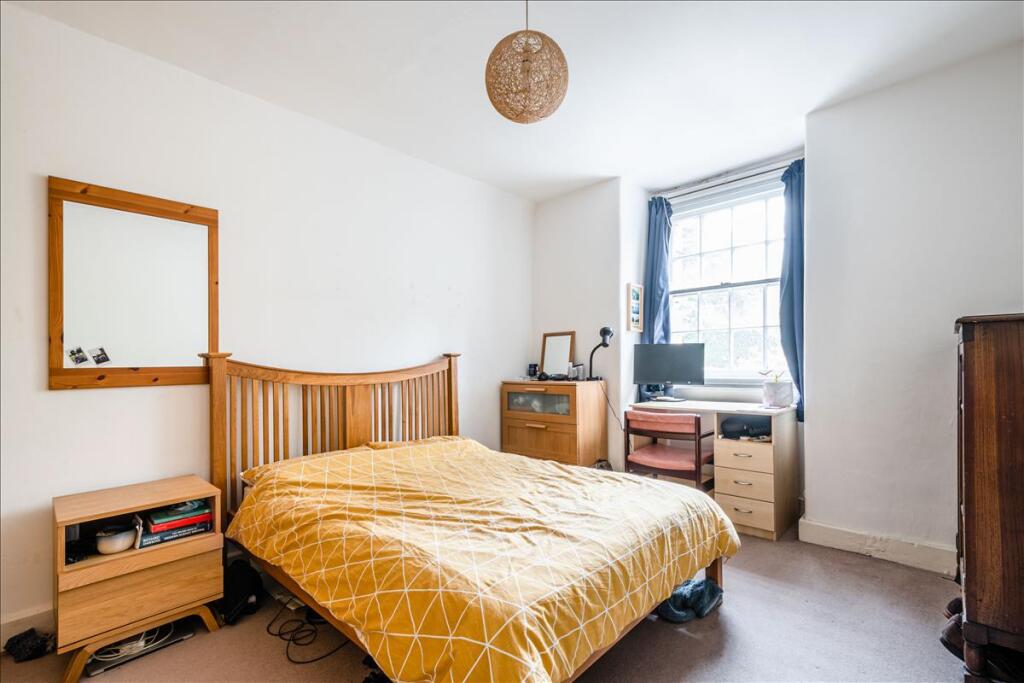 Comprising a generous master bedroom with built-in wardrobes, there is a separate reception that benefits from secondary glazing and high ceilings, a fully-fitted kitchen with small dining area and tiled bathroom with shower above bath.