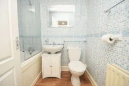 Panelled bath with shower mixer tap and shower unit above, pedestal wash hand basin, low level wc.