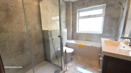 Bath, shower cubicle, wash hand basin, mixer taps.