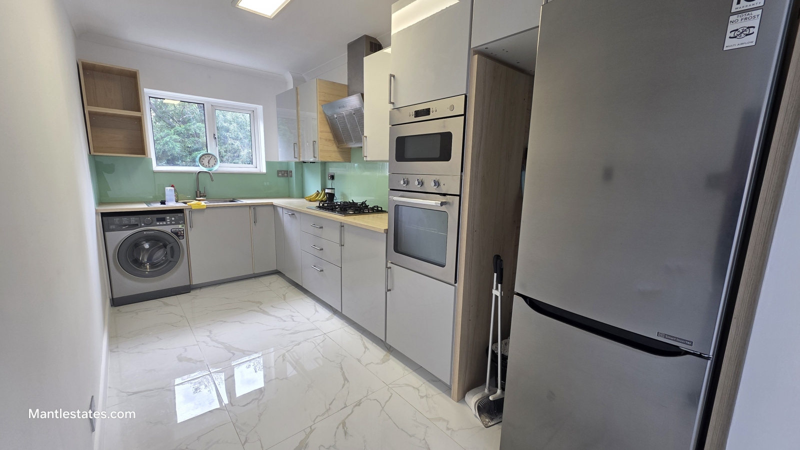 Glass splashback, gas hob, integrated oven, marble flooring, double-glazed window.