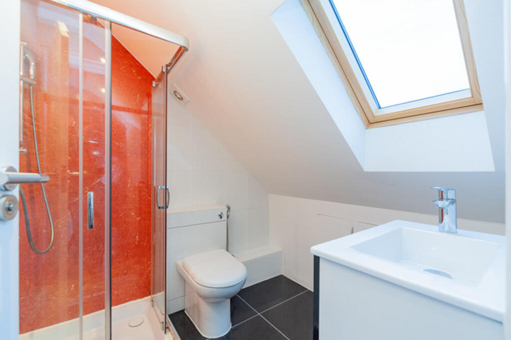 There are three contemporary bathrooms, all fully tiled, including a stylish en-suite to the principal bedroom. Additional features include four W/Cs, wood flooring to the living and landing areas, double-glazed windows, an entry phone system, and a private driveway with space for two vehicles.