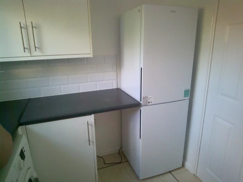 kitchen with white units, electric oven, fridge/freezer