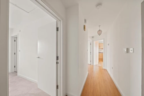 ENTRANCE HALLWAY Entryphone, wood laminate flooring.