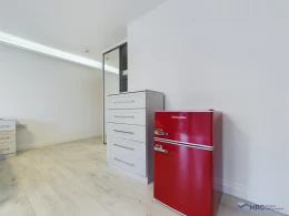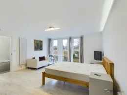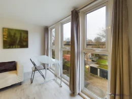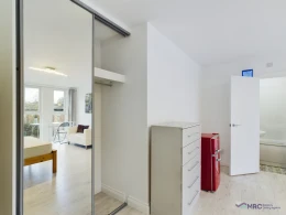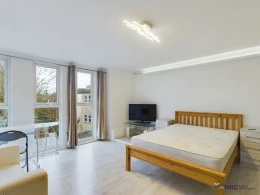 This stylish and modern studio offers a bright and inviting living space, thanks to its floor-to-ceiling windows that let in plenty of natural light. The room is fully furnished with a comfortable bed and mattress, a cosy sofa, a TV, a dining table/desk, fitted wardrobes, and a chest of drawers for ample storage. A mini fridge is also included for convenience.