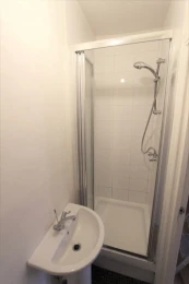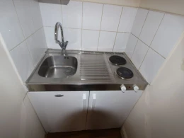 Laminate flooring throughout with a kitchenette, bathroom with cubicle shower.